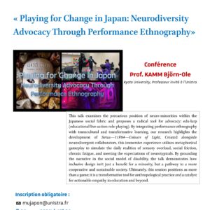 La Maison Universitaire France-Japon, en collaboration avec The Japan Society for the Promotion of Science (JSPS), a le plaisir de vous convier à la conférence du: Prof. Björn-Ole KAMM Kyoto University, Professeur invité à l’Unistra Sur le thème : « Playing for Change in Japan: Neurodiversity Advocacy Through Performance Ethnography» INSCRIPTION OBLIGATOIRE: mujapon@unistra.fr Conférence tout public, […]